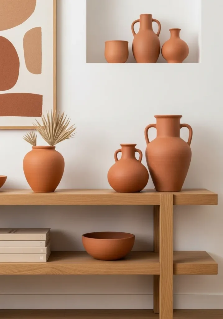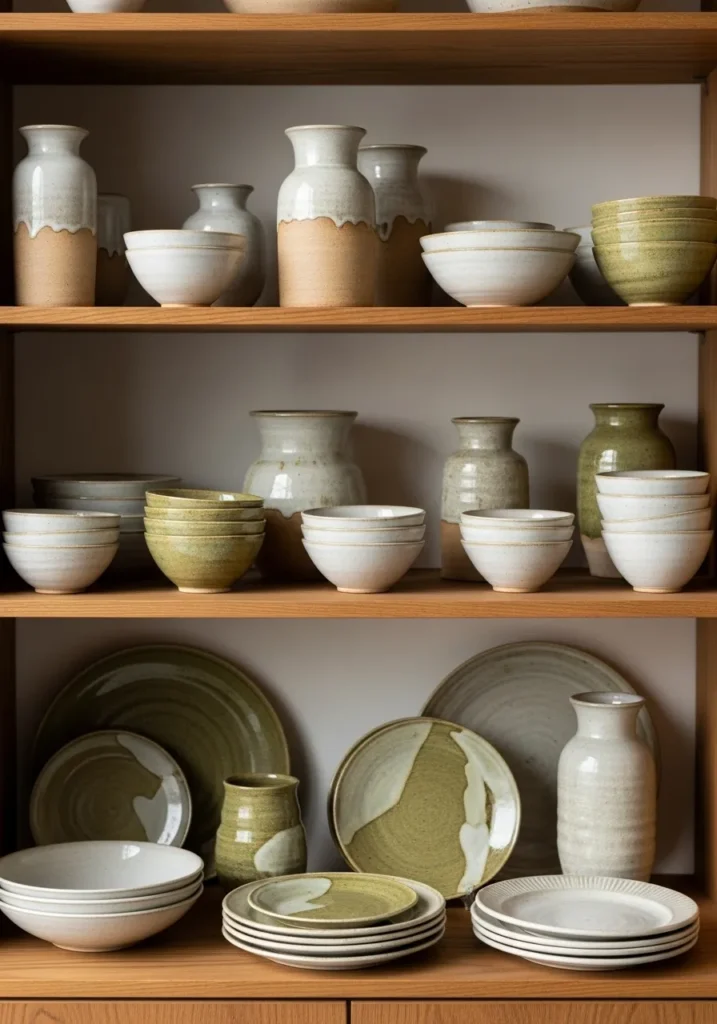 Open wooden shelving enhances the natural feel, allowing every piece to breathe and be admired as functional art. Arranging them asymmetrically adds a touch of spontaneity—each curve, glaze, and silhouette contributing to a cohesive yet dynamic composition.