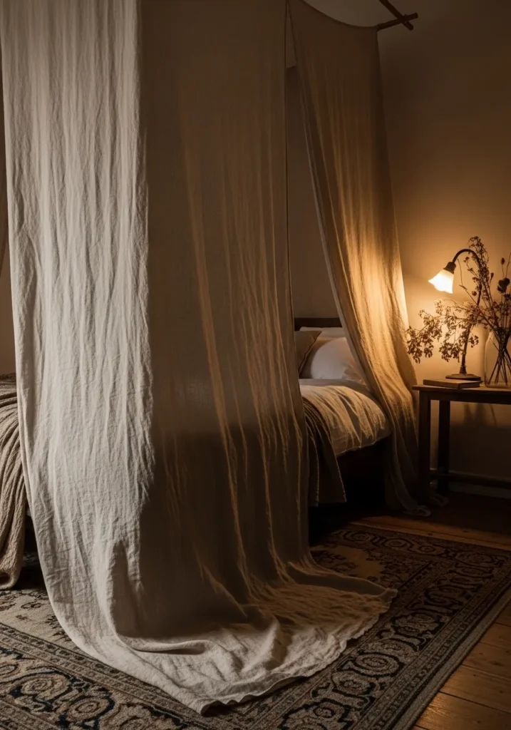 Complement the canopy with soft, ambient lighting, such as bedside lamps or fairy lights, to create a warm, inviting glow. Add dried floral arrangements, like pampas grass or lavender, for texture and subtle natural fragrance. These touches reinforce the rustic yet refined aesthetic, bridging comfort and elegance.