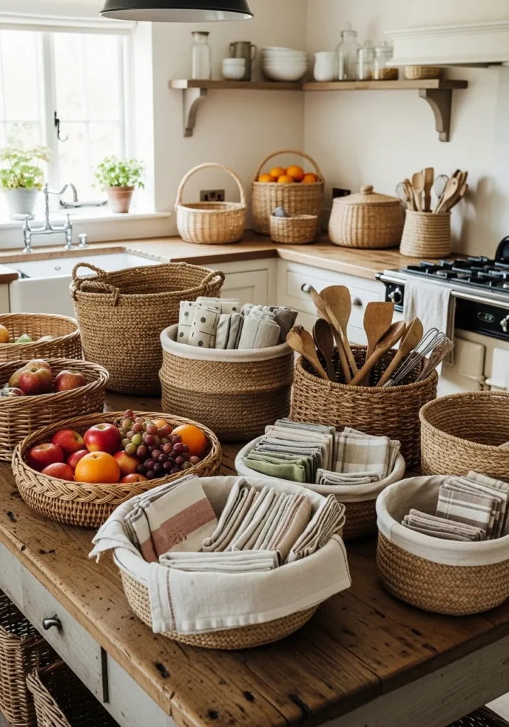 Cottage-Inspired Kitchen Baskets combine practicality with timeless charm, turning everyday storage into a design feature. Handwoven baskets in natural fibers hold fruits, linens, and utensils while adding texture and warmth to the kitchen. Displaying them openly emphasizes their artisanal quality, making function feel inherently beautiful.