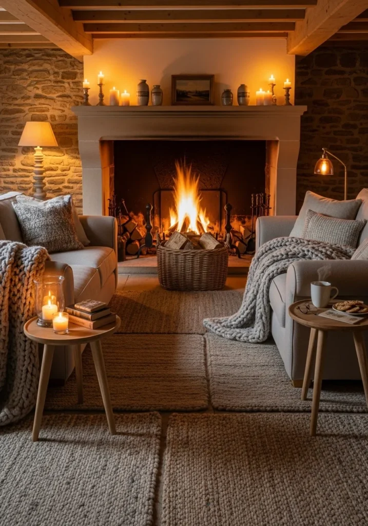 This inviting setup transforms a simple fireplace into a sanctuary of comfort, blending tactile luxury with the serene rhythm of cottage living.