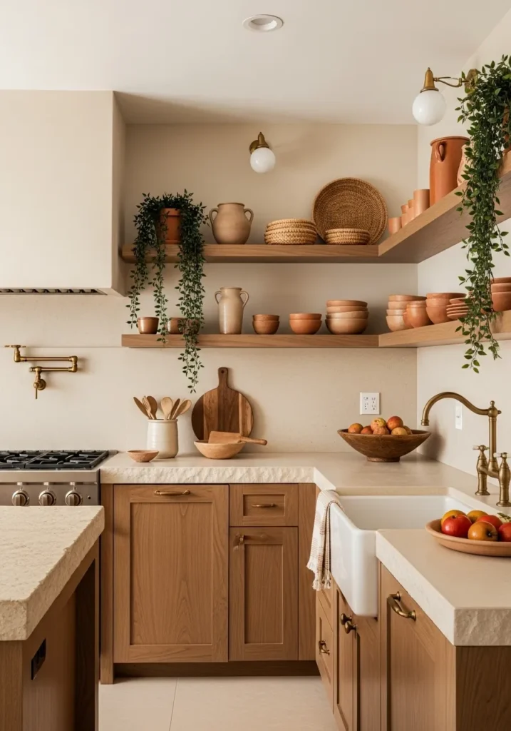 Replace upper cabinets with open shelving to showcase handmade pottery, woven baskets, and ceramic dishware. These artisanal details not only highlight craftsmanship but also create a lived-in warmth that celebrates everyday beauty. The addition of trailing greenery, such as potted herbs or cascading ivy, introduces a touch of freshness and vitality, blurring the line between indoors and nature.