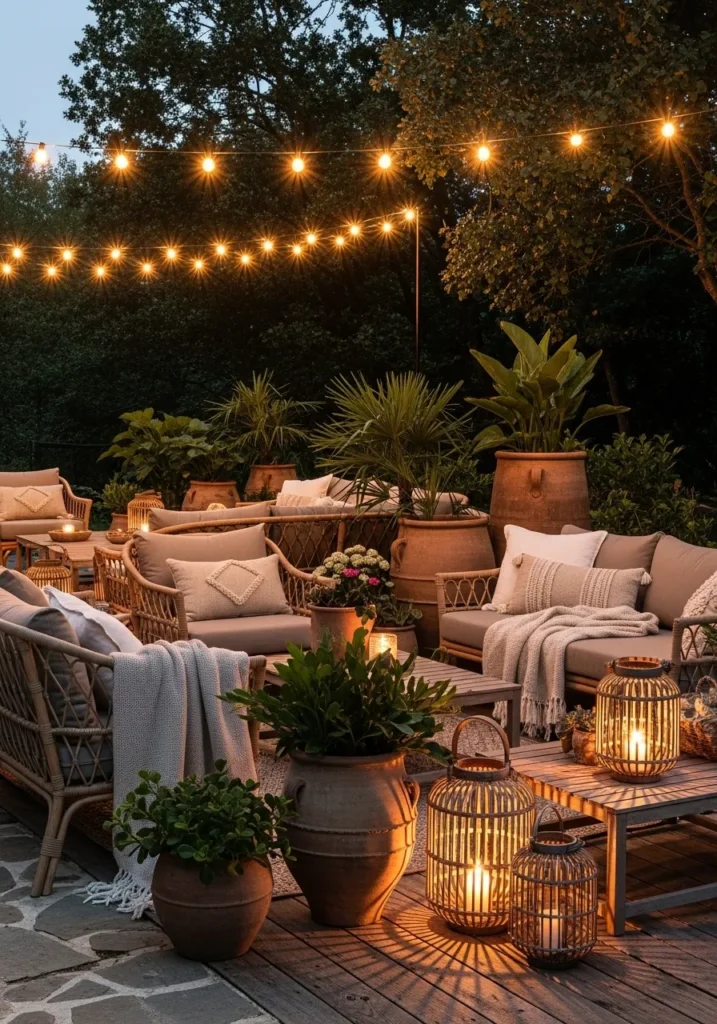 String lights draped overhead add a magical, ambient glow for evening gatherings, highlighting the textures and tones of the outdoor space. The mix of organic materials—wood, clay, and natural fibers—grounds the design, making it feel both inviting and harmonious with its surroundings.