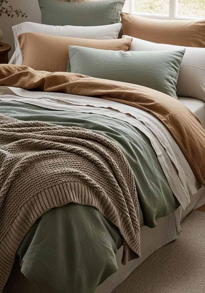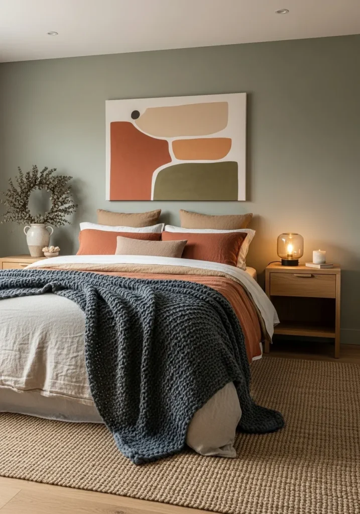 An earthy bedroom sanctuary begins with a palette inspired by the natural world—warm taupes, muted greens, and soft creams. Linen bedding and wool throws layer effortlessly, creating depth and comfort. Wooden nightstands, rattan baskets, and handcrafted ceramics introduce tactile warmth, making the space feel authentic and grounded.