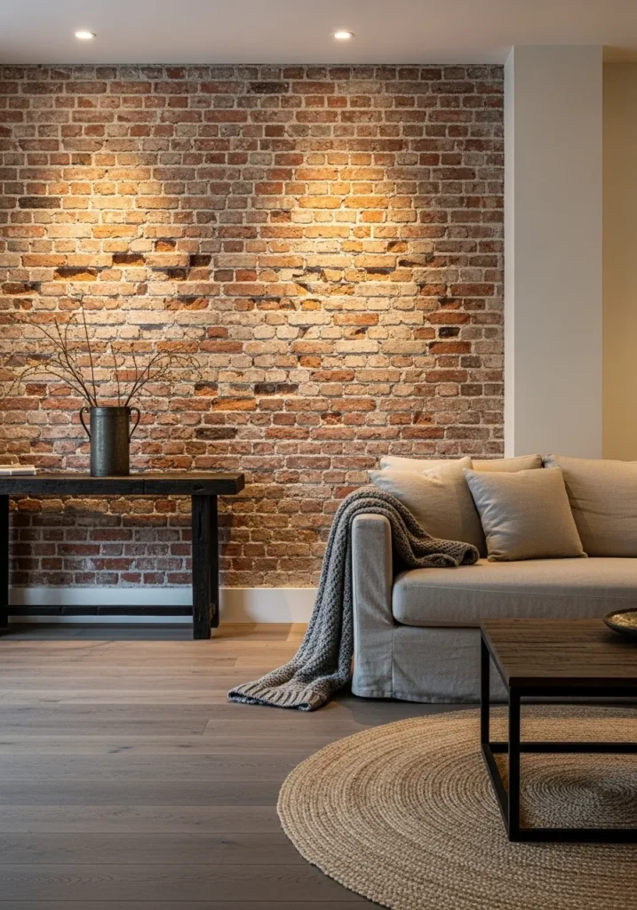 To elevate the look, pair the wall with neutral fabrics, dark wood furniture, and aged metal accents. This combination enhances the warmth of the brick while maintaining an earthy, balanced aesthetic. Soft lighting or wall sconces will highlight its organic texture, creating cozy visual drama.