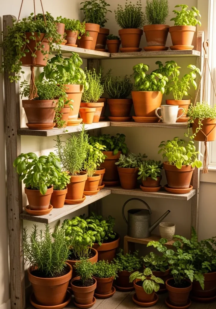 A Greenhouse Corner brings vitality and serenity indoors, creating a space where nature and design coexist beautifully. Use terracotta pots, ceramic planters, and vintage wooden or metal shelving to display a mix of herbs, succulents, and leafy plants. The variety of textures and shades of green introduces life and energy, transforming a simple corner into a living focal point.