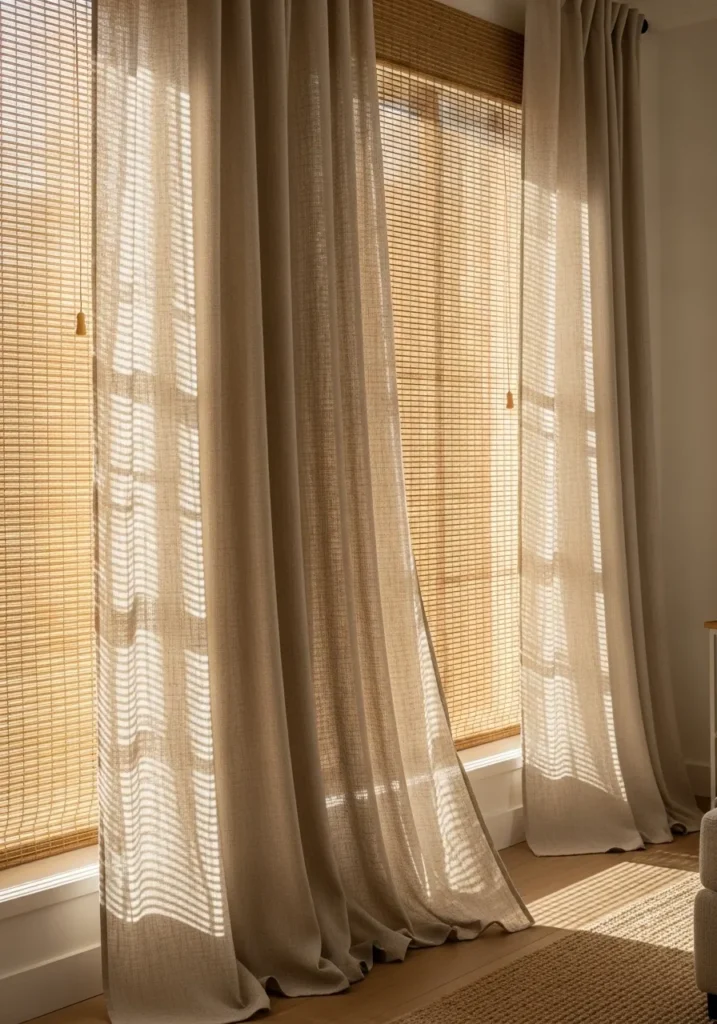Layering linen with woven blinds adds dimension and practicality. The contrast between fabric and natural fiber creates tactile harmony, balancing light control with style. Together, they frame the view as though nature itself is part of the décor.