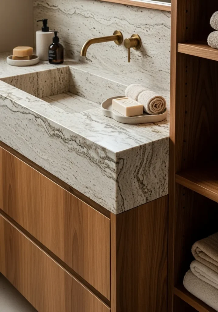 Enhance the aesthetic with simple, natural accessories—ceramic trays, cotton towels, and small potted greenery. These elements complement the stone and wood, reinforcing the cohesive, earthy palette without cluttering the space. The textures and tones work together to create a calming, spa-like atmosphere.