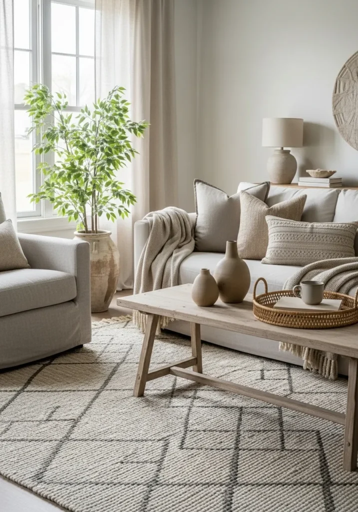 A Neutral Layered Living Room embraces the beauty of simplicity through soft, tonal harmony. Shades of cream, stone, and oatmeal form the foundation, creating an atmosphere that feels calm and inviting. The key lies in texture—linen upholstery, rattan accents, and cozy wool throws work together to bring depth without distraction, offering a refined yet comfortable aesthetic.