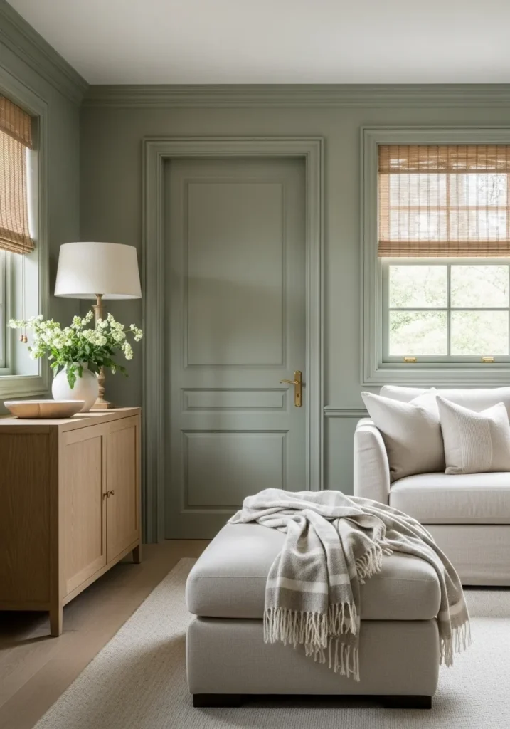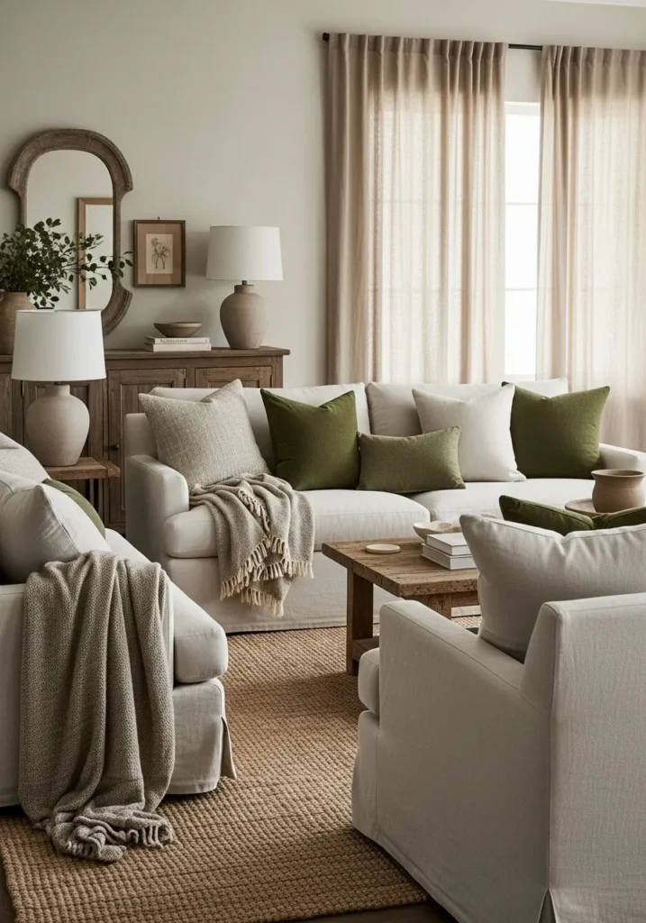 Elegant touches—like brass handles, antique mirrors, and woven blinds—elevate the design with understated luxury. Each detail contributes to a timeless, tranquil setting that feels effortlessly curated. This palette embodies the essence of modern rustic elegance: soothing, nature-inspired, and eternally graceful.