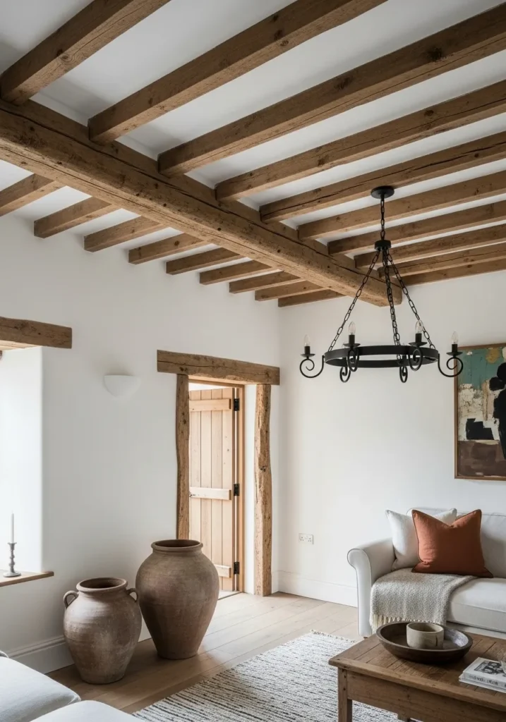 To complement the rustic ceiling, introduce elements that echo its quiet strength. A wrought iron chandelier suspended at the center brings understated elegance and subtle drama, its dark silhouette contrasting beautifully with the pale backdrop. Beneath, layer soft wool rugs, stoneware vases, and earthen pottery to ground the space in natural materials. These textures work together to create an environment that feels curated yet deeply comforting—a perfect marriage of simplicity and sophistication.