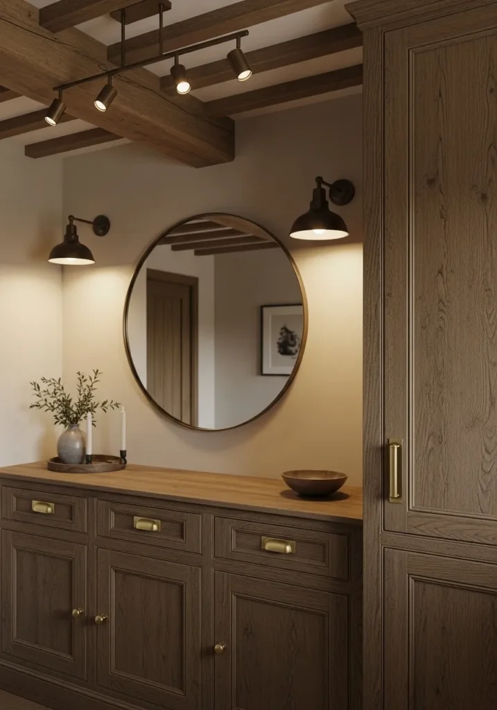 This simple yet impactful detail anchors the space in balance and beauty. Rustic mirror features combine artistry with practicality, turning a reflective surface into a focal point that enriches the room’s warmth, depth, and natural elegance.