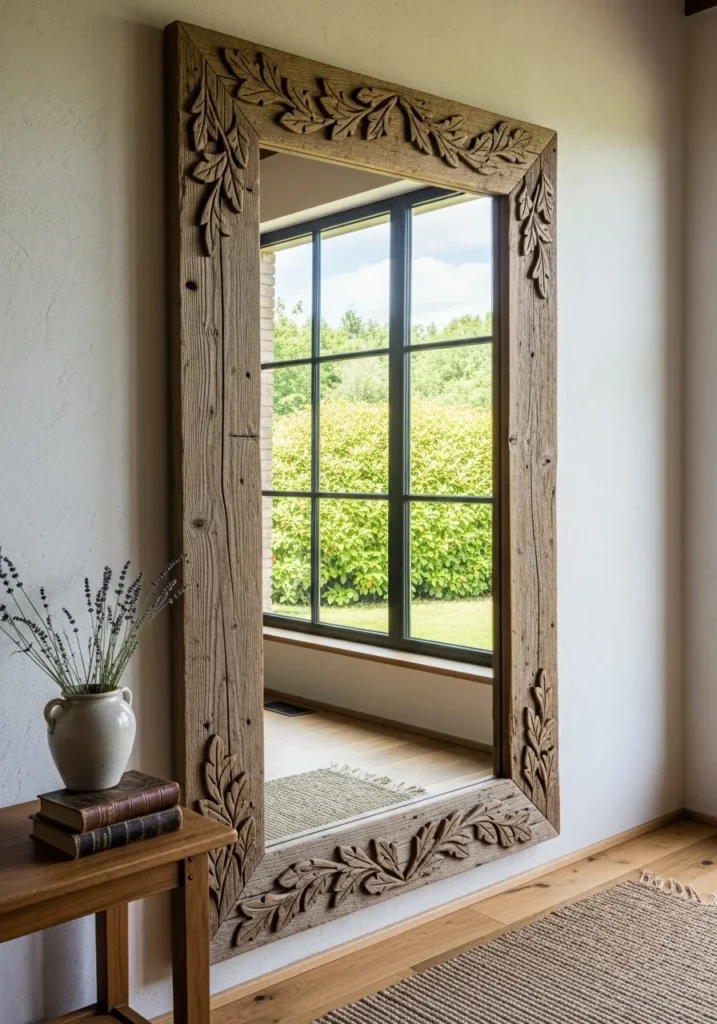 A Rustic Mirror Feature elevates any room with both functionality and aesthetic charm. Choose a large mirror framed in weathered or carved wood to introduce texture and personality. Its reflective surface amplifies natural light, making hallways, living rooms, or entryways feel brighter and more spacious while maintaining an organic, grounded vibe.