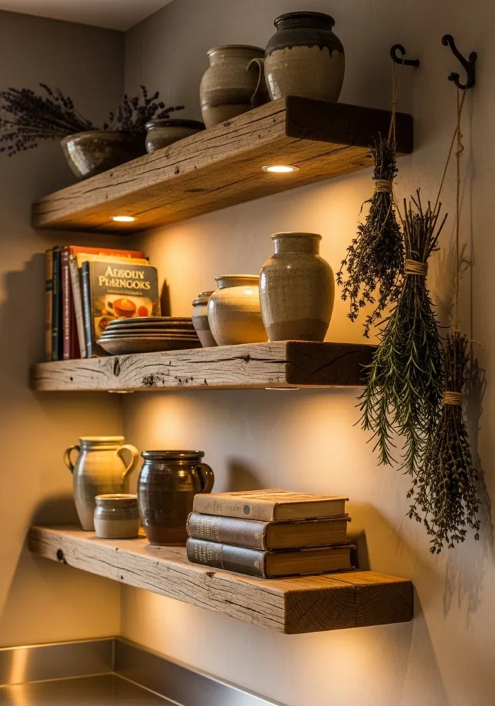 Style the shelves with pottery, vintage cookbooks, and bunches of dried herbs to create a lived-in, cottage-inspired look. The combination of raw wood and curated details evokes a sense of balance between simplicity and sophistication. Soft, ambient lighting enhances the texture, casting gentle shadows that emphasize the wood’s natural depth.