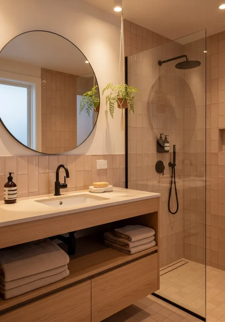 A Soft Clay Bathroom captures the essence of earthy tranquility and understated luxury. Use clay or sand-colored tiles to create a spa-like foundation, pairing them with wooden vanities and matte black fixtures for grounded contrast. The warm, natural tones instantly calm the senses, transforming daily routines into quiet rituals of wellness.