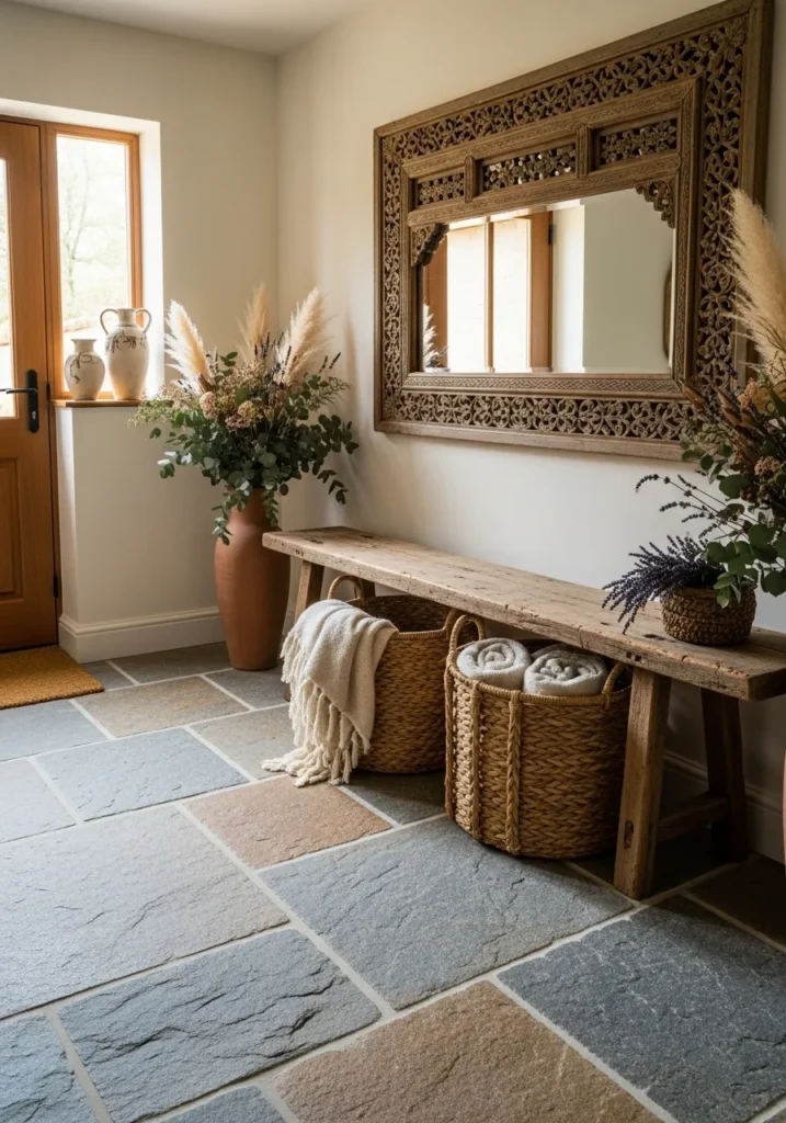 A Stone Entryway with Organic Decor sets the tone for a warm and grounded home. The textured stone flooring instantly evokes timeless elegance while offering durability and natural charm. A reclaimed wood bench anchors the space with rustic authenticity, and woven rattan baskets provide both style and function—perfect for storing shoes, scarves, or seasonal accents.