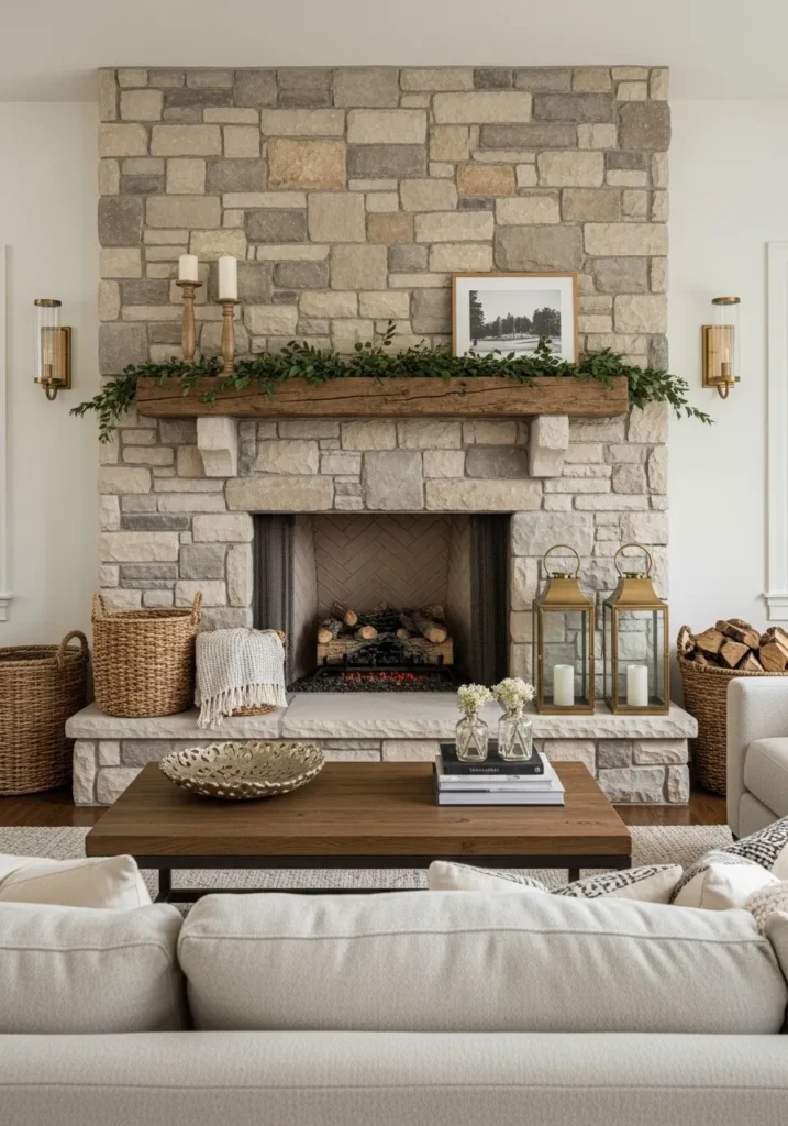 Create a haven of comfort and sophistication with a Warm Stone Fireplace Sanctuary, where rustic charm meets timeless luxury. A grand stone fireplace serves as the heart of the room, its textured surface exuding strength and warmth. Surround it with woven baskets filled with chunky knit blankets and soft neutral-toned throws that invite relaxation. Gentle, amber lighting from brass sconces or lanterns enhances the stone’s natural hues, casting a golden glow that feels both intimate and inviting.