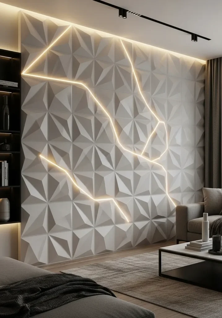 To elevate the effect, incorporate warm and directional lighting that accentuates the wall’s geometry. Recessed LEDs, wall washers, or hidden strip lights can highlight the contours, adding drama without overwhelming the room. Pair the feature with minimalist furniture and metallic or glass accents to maintain a sleek, futuristic aesthetic. The outcome is a statement-making interior that feels sophisticated, modern, and artfully designed.