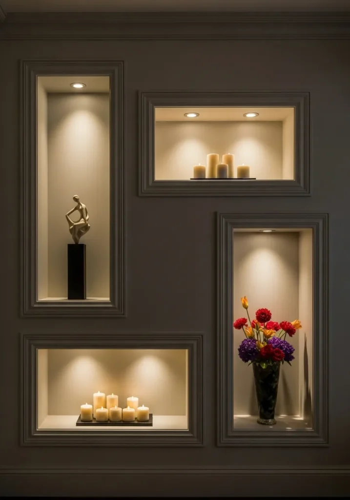 When framed with molding or integrated lighting, each niche becomes a beautifully illuminated display. Recessed LEDs or soft spotlights highlight textures, shapes, and materials, turning sculptures, candles, or floral arrangements into focal points. The gentle glow not only enhances the showcased objects but also adds warmth and dimension to the overall interior, giving it an upscale, gallery-like atmosphere.