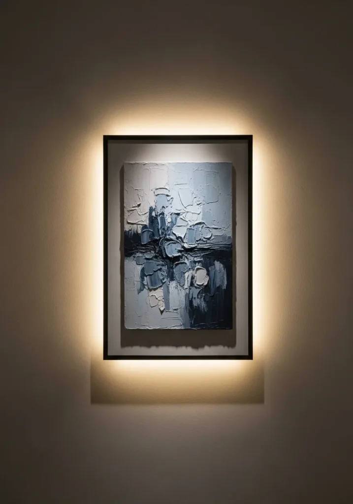 Ideal for modern and minimalist interiors, the backlit floating art frame works beautifully in neutral spaces where subtlety and precision define the aesthetic. Pair it with clean-lined furniture, matte finishes, and layered lighting for a cohesive, high-end look. The result is a serene yet striking statement that celebrates art, craftsmanship, and contemporary luxury in perfect harmony.