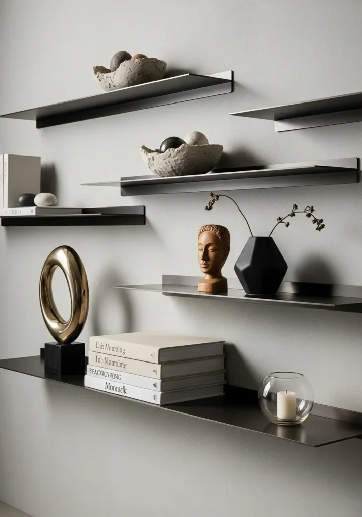 Floating shelves with art and sculptures offer a sleek, modern way to display personality and sophistication within a luxury living room. Their minimalist design—crafted from dark wood, glass, or metal—appears weightless, creating an airy and refined aesthetic. These shelves not only maximize wall space but also serve as curated showcases for artistic expression, transforming a simple wall into an elegant composition of texture, form, and style.