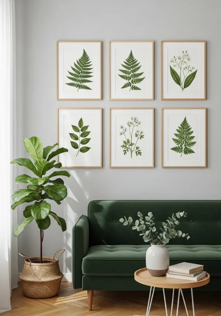 The symmetry and repetition of the arrangement lend a sense of order and calm to the space. Whether displayed in a grid or linear layout, the consistency in framing and spacing creates visual harmony that enhances the overall interior balance. The botanical imagery, with its intricate details and soft color palette, provides a gentle contrast to modern furnishings and architectural elements, making the room feel both elegant and welcoming.