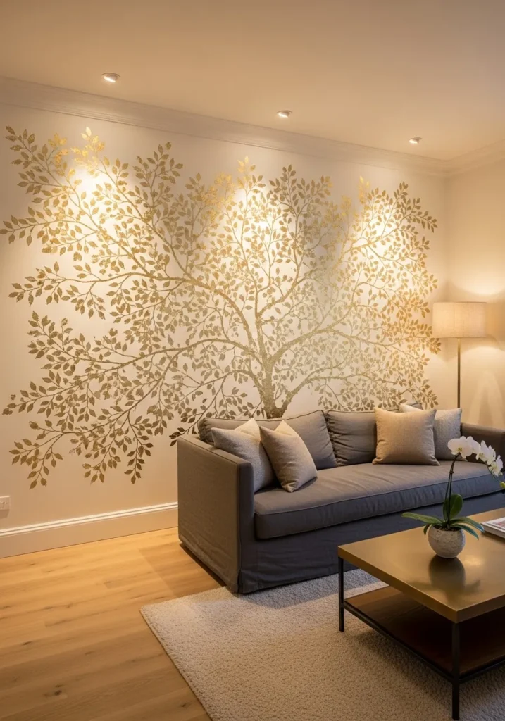 To let the mural shine, balance it with neutral-toned furniture and soft, layered lighting. Wall sconces, recessed LEDs, or pendant lights can gently highlight the painted details without overpowering them. Choose understated textures—like linen, velvet, or stone—to complement the artwork’s depth. The result is a luxurious, gallery-like living space where artistry and interior design coexist beautifully, creating a deeply personal yet sophisticated ambiance.