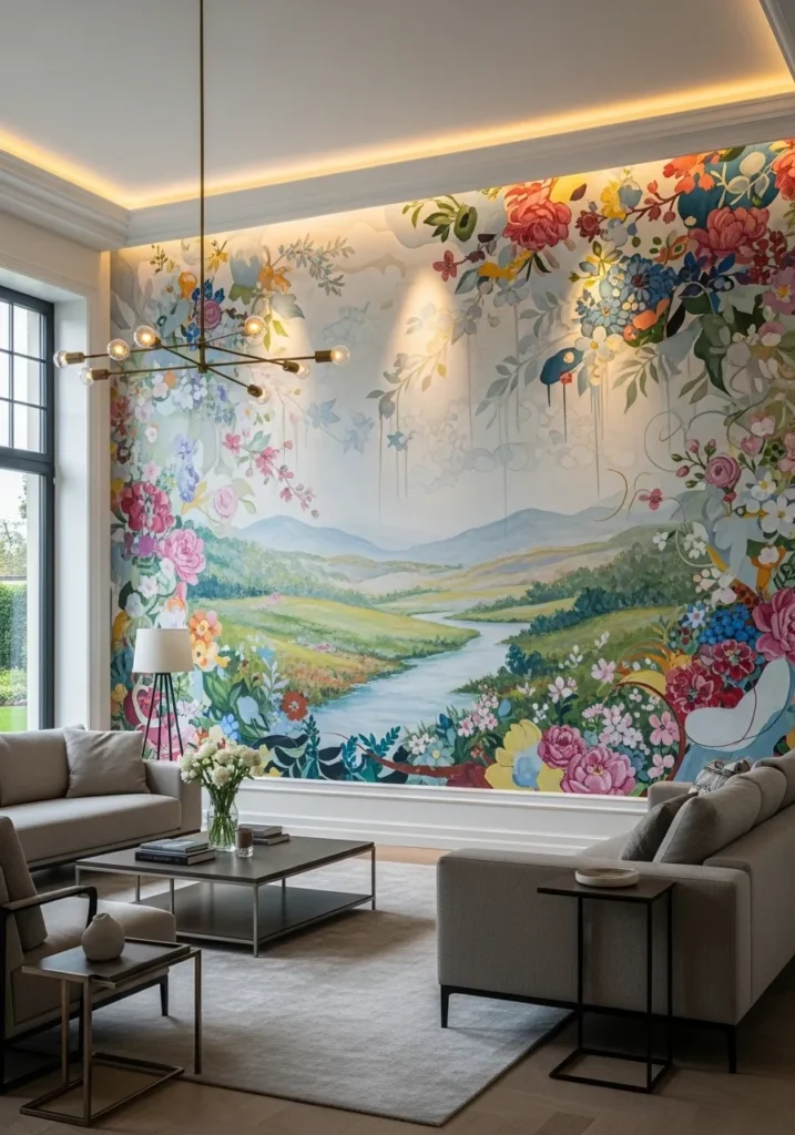 A hand-painted mural wall transforms a living room into a one-of-a-kind artistic statement, merging personal expression with timeless elegance. Whether it features delicate florals, sweeping abstract forms, or serene landscapes, a custom mural captures individuality and sophistication. Each brushstroke tells a story, infusing the space with emotion, depth, and artistry that mass-produced prints simply cannot replicate.