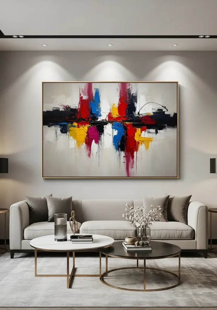 To maintain harmony, pair the bold artwork with understated furnishings and refined materials. Neutral sofas, glass tables, and metallic decor elements—such as gold or chrome accents—complement the piece without detracting from its impact. The result is a beautifully balanced space where art and design coexist seamlessly, exuding modern luxury and sophisticated taste.
