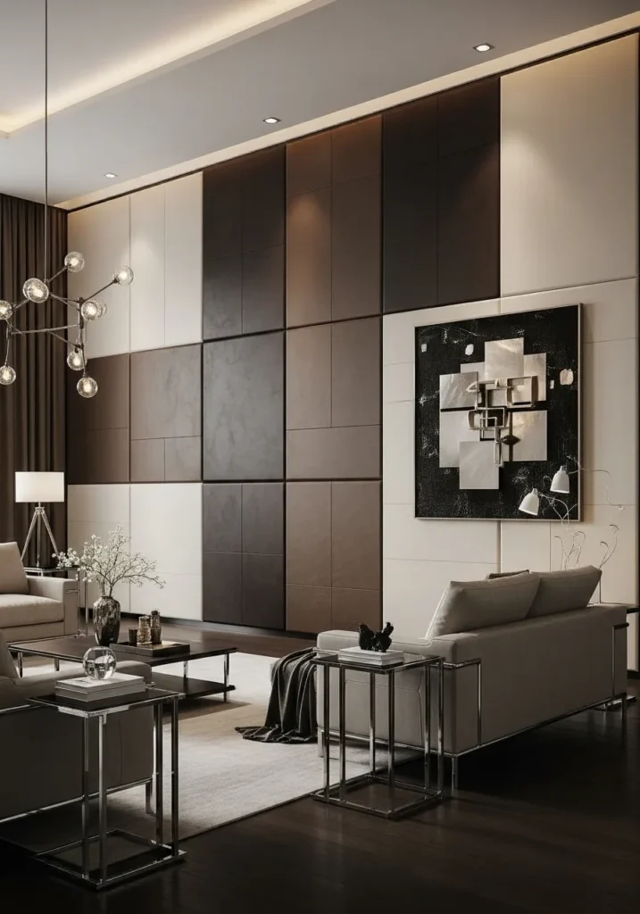 A statement wall with metallic tiles instantly transforms a living room into a space of radiance and sophistication. These small, shimmering tiles—arranged in geometric or mosaic patterns—reflect light beautifully, creating a dynamic play of shine and shadow across the surface. Whether you choose brushed gold, antique bronze, or sleek pewter finishes, the result is a wall that feels both luxurious and contemporary.