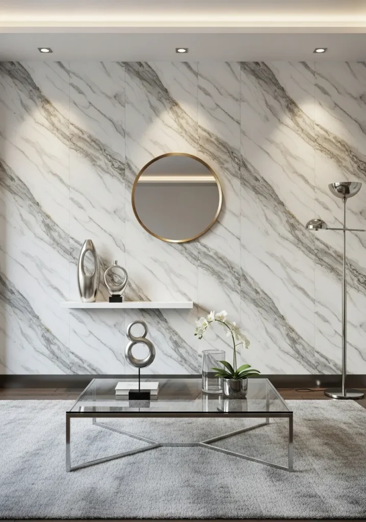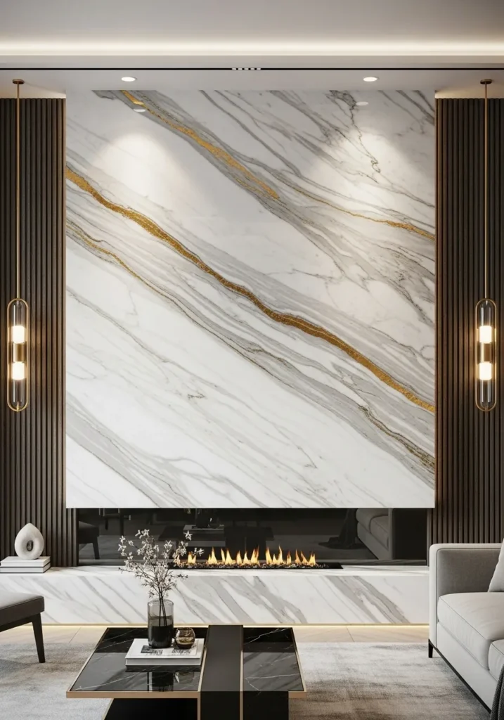 To let the wall take center stage, pair it with minimalist furniture and soft ambient lighting. Clean lines, neutral palettes, and warm textures like linen or wood complement the marble without competing for attention. Strategically placed lighting can highlight the stone’s texture and the subtle gleam of gold, turning the wall into a breathtaking visual statement. This combination captures timeless luxury, elevating any interior with a sense of effortless grandeur.