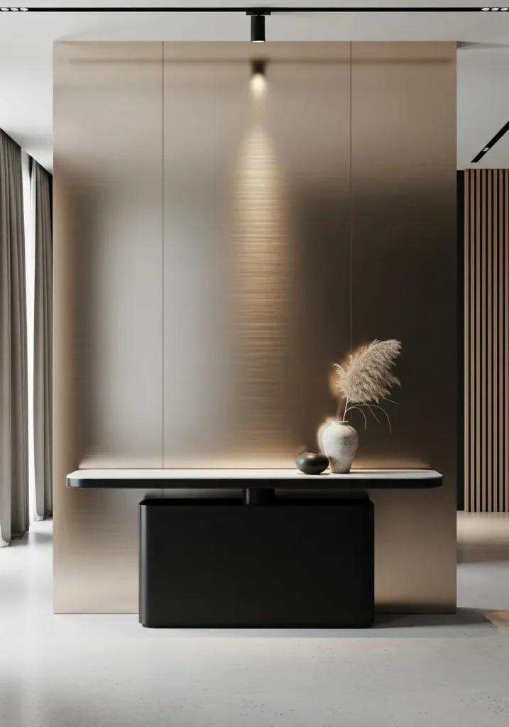 To maintain harmony, complement the metallic wall with matte furniture, clean lines, and minimalist décor. Soft fabrics, muted tones, and natural materials like wood or stone provide contrast, ensuring the wall remains the centerpiece. A few well-placed metallic accents—like lamps or frames—can tie the look together seamlessly. The result is an effortlessly chic and contemporary space that radiates understated glamour and timeless appeal.