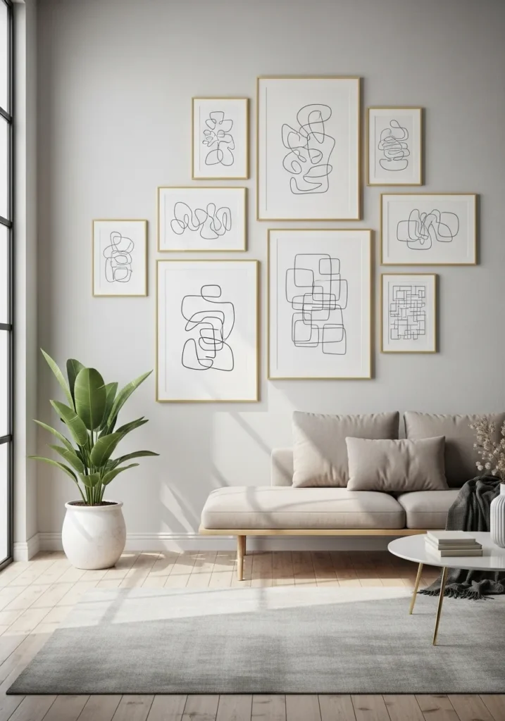 To complete the look, pair the gallery with neutral-toned walls and soft ambient lighting. The restraint of the line art allows surrounding textures—velvet sofas, marble tables, or wood finishes—to shine harmoniously. This approach embodies refined minimalism—elegant, balanced, and timelessly stylish.