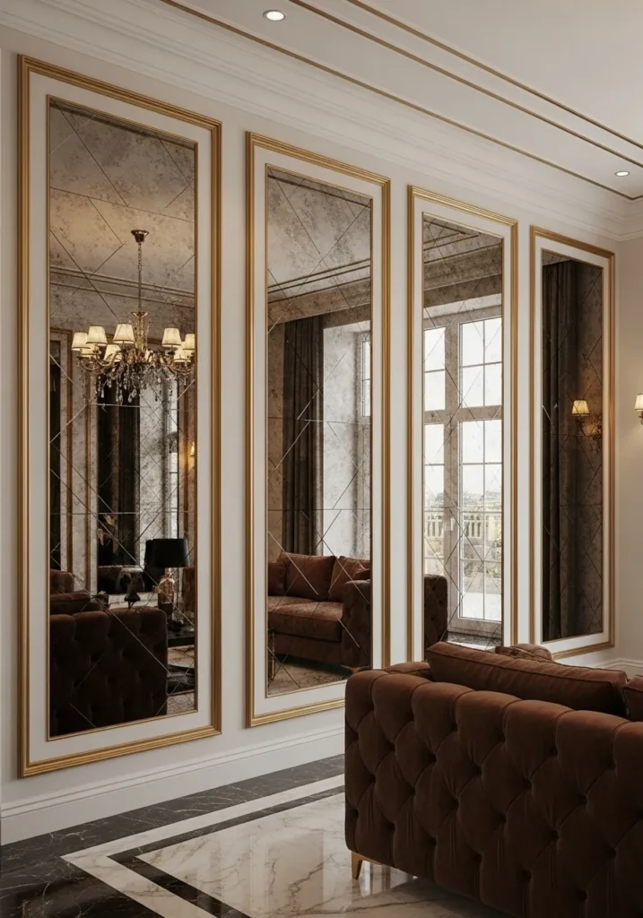 A wall of decorative mirrors transforms an ordinary space into a radiant and sophisticated focal point, enhancing both light and dimension. The reflective surfaces amplify natural and artificial light, making the room feel brighter and more open. This design not only adds elegance but also creates a sense of movement and spaciousness, making it especially effective in living rooms where you want to evoke airiness and luxury.