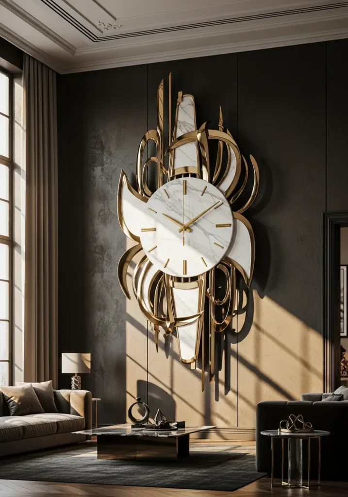 An oversized designer wall clock serves as both a statement piece and a functional work of art, instantly commanding attention within a luxury living room. Its bold, sculptural presence draws the eye, grounding the space with elegance and purpose. Beyond timekeeping, it acts as a central design feature—balancing scale, proportion, and aesthetic harmony while reflecting a sense of sophistication and style.