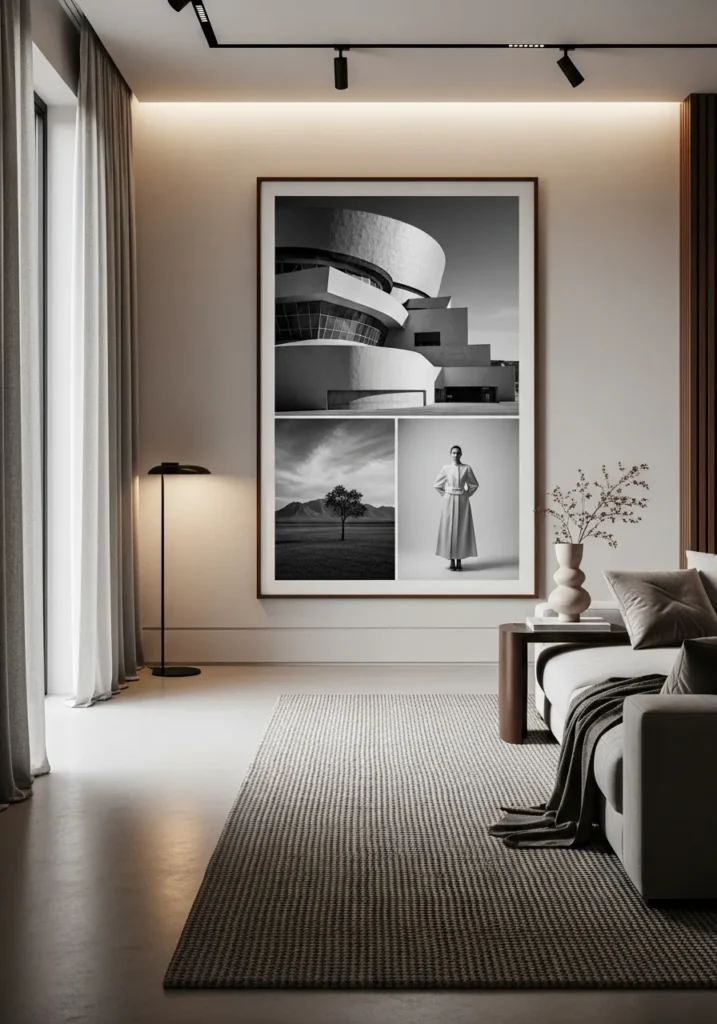 Oversized framed photography introduces a sophisticated, gallery-inspired ambiance to the living room, blending artistry with modern design. Large-scale black-and-white prints, framed in sleek metal or refined wood, make a bold yet timeless statement. Their clean lines and monochrome palette lend balance and calmness to the space, offering a sense of depth and emotion that enhances the overall atmosphere of refined luxury.