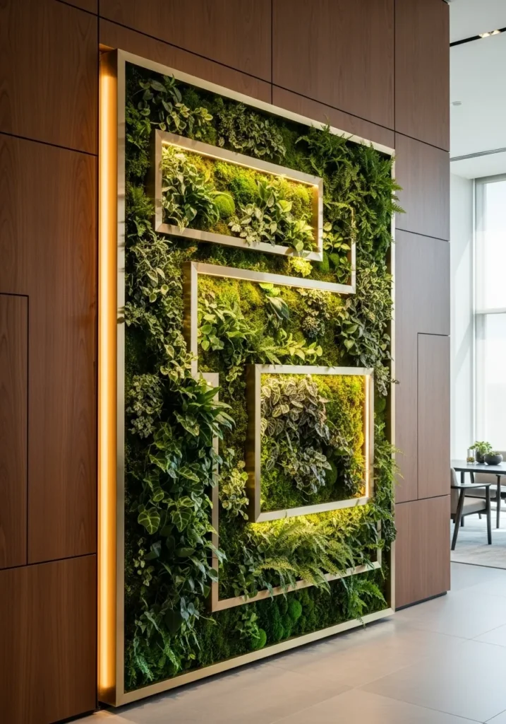 The framed composition transforms the garden wall from a natural feature into a refined piece of living art. Brass, gold, or matte black framing lends structure and sophistication, defining the greenery like a masterpiece on display. Integrated LED lighting adds an ethereal glow, highlighting the foliage’s textures and creating depth and warmth, especially in evening settings. This combination of light, form, and nature elevates the wall from simple décor to a luxurious design statement.
