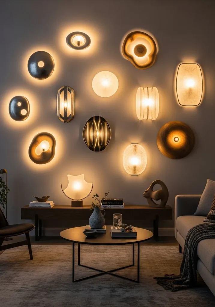 A wall of curated sculptural lighting merges art and functionality, transforming illumination into a design statement. Each fixture serves as both a source of light and a piece of sculpture, adding texture, rhythm, and visual intrigue to the living space. Whether crafted from glass, metal, or ceramic, these lights create layers of glow and shadow that elevate the atmosphere with effortless sophistication.