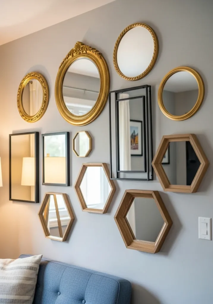 By mixing shapes, sizes, and frame styles, the arrangement gains artistic flair and individuality. Round, rectangular, or geometric mirrors framed in gold, bronze, or matte black create visual rhythm and layered interest. The interplay of reflections and textures adds a touch of playful sophistication, balancing formality with creativity. Each mirror becomes a decorative element that contributes to the wall’s dynamic composition.